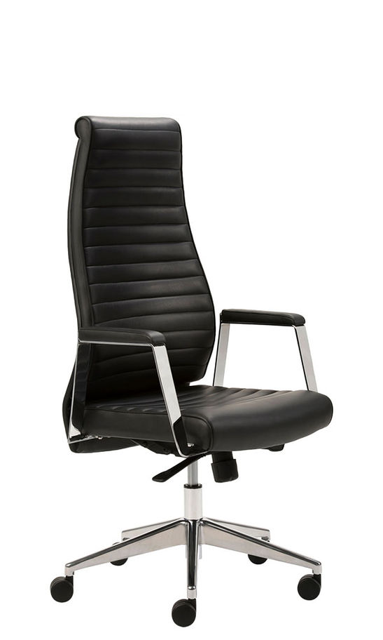 Hoher Rücken, Vorderseite Echtleder Schwarz, Steppnähte, Chrom-Armlehnen fest mit Echtleder - Polsterung, Synchronmechanik mit individueller Gewichtseinstellung, stufenlose Höhenverstellung durch Gasfeder, Alu-Fuß-kreuz poliert, inkl. Universalrollen.