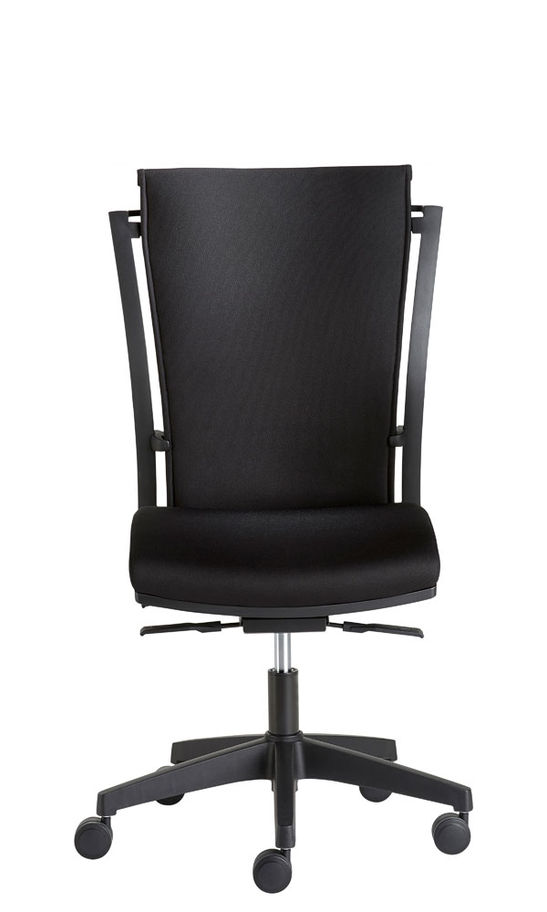 Sitz und Rücken gepolstert, verstellbare Lendenwirbelstütze, selbstregulierende Synchronmechanik mit Sitztiefenverstellung, stufenlose Höhenverstellung durch Gasfeder, Kunststoff-Fußkreuz Schwarz, große Universalrollen, auch für Hartböden geeignet. Bezugsfarbe Schwarz.