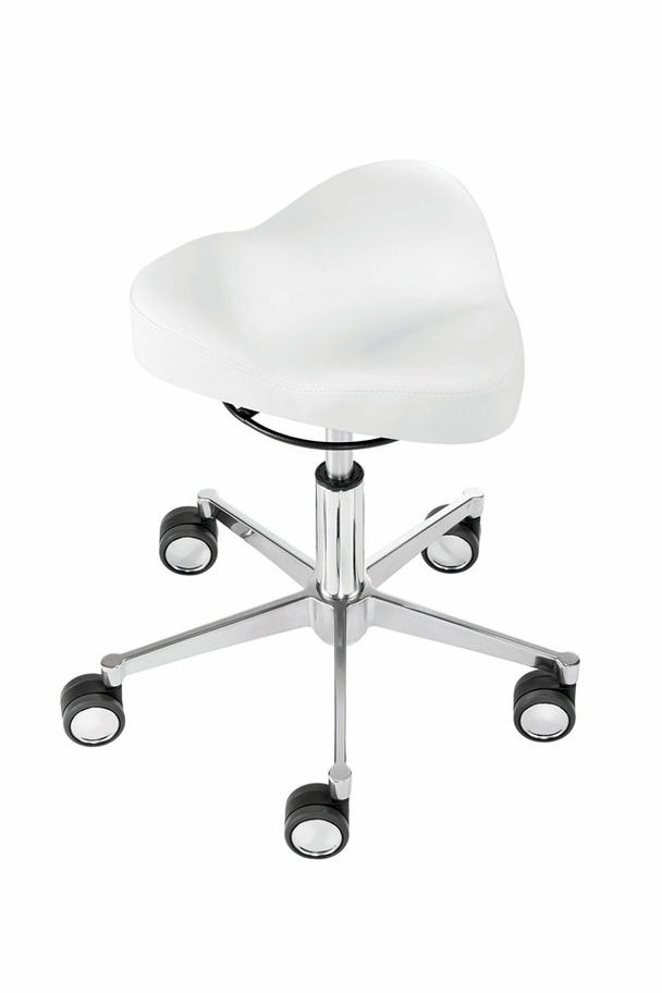 Dreiecksitz, Bewegungsfreiheit 360°, Ringauslöser, stufenlose Höhenverstellung durch Gasfeder, Alu-Fußkreuz, Hartbodenrollen mit Chromblende, Sitzhöhe 39 - 50 cm. Gestellfarbe Chrom.