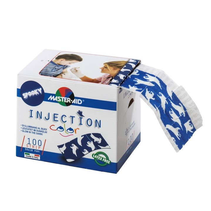 Die kleinen, rundum klebenden Trostp!aster sind ideal zur sanften Abdeckung von Punktions- und Injektionsstellen und lassen sich ebenso gut zur Wund- versorgung kleinerer Verletzungen einsetzen. Die antiadhäsive Wundau!age und die vergleichsweise geringe Klebe!äche erlauben das schmerzarme Entfernen ganz ohne Tränen. Die farbenfrohen Designs der beiden INJECTION- Kinderp!aster, insbesondere das nachtleuchtende Geistermotiv, wecken Fan- tasie und sorgen für Ablenkung. Damit sind Schreck und Schmerz blitzschnell vergessen. • sanft schützende, rundherum klebende Wundabdeckung zur Versorgung von kleinen, oberflächlichen Hautverletzungen • mit fantasievollen Motiven für eine verbesserte Compliance • dank Perforation schnell und einfach von der Rolle abzureißen